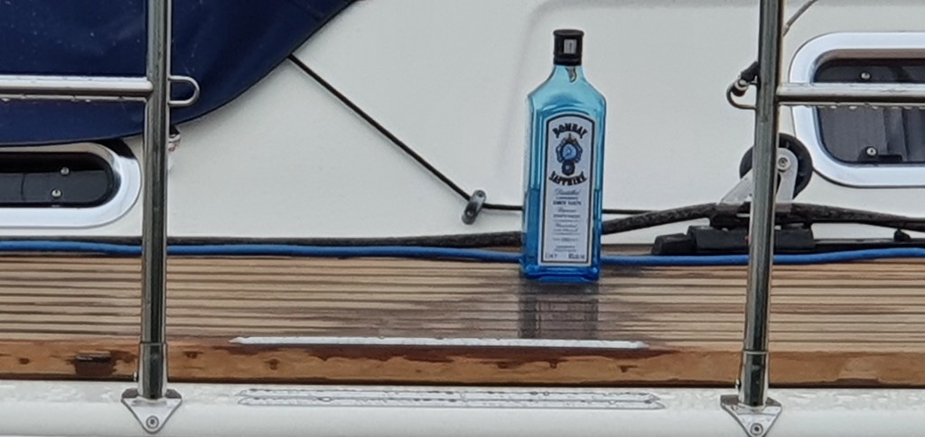 Da offensichtlich das mäßig gelungene Einlaufmanöver den Frohsinn der Mannschaft trübte, tröstete man sich dann nicht nur mit dem einen oder anderen Einlaufbier, sondern überwand die Missstimmung schnell mit Cuba Libre. Am Morgen blieb dann noch allein und auf sich gestellt an Deck der Nachbarn eine Flasche Gin stehen.